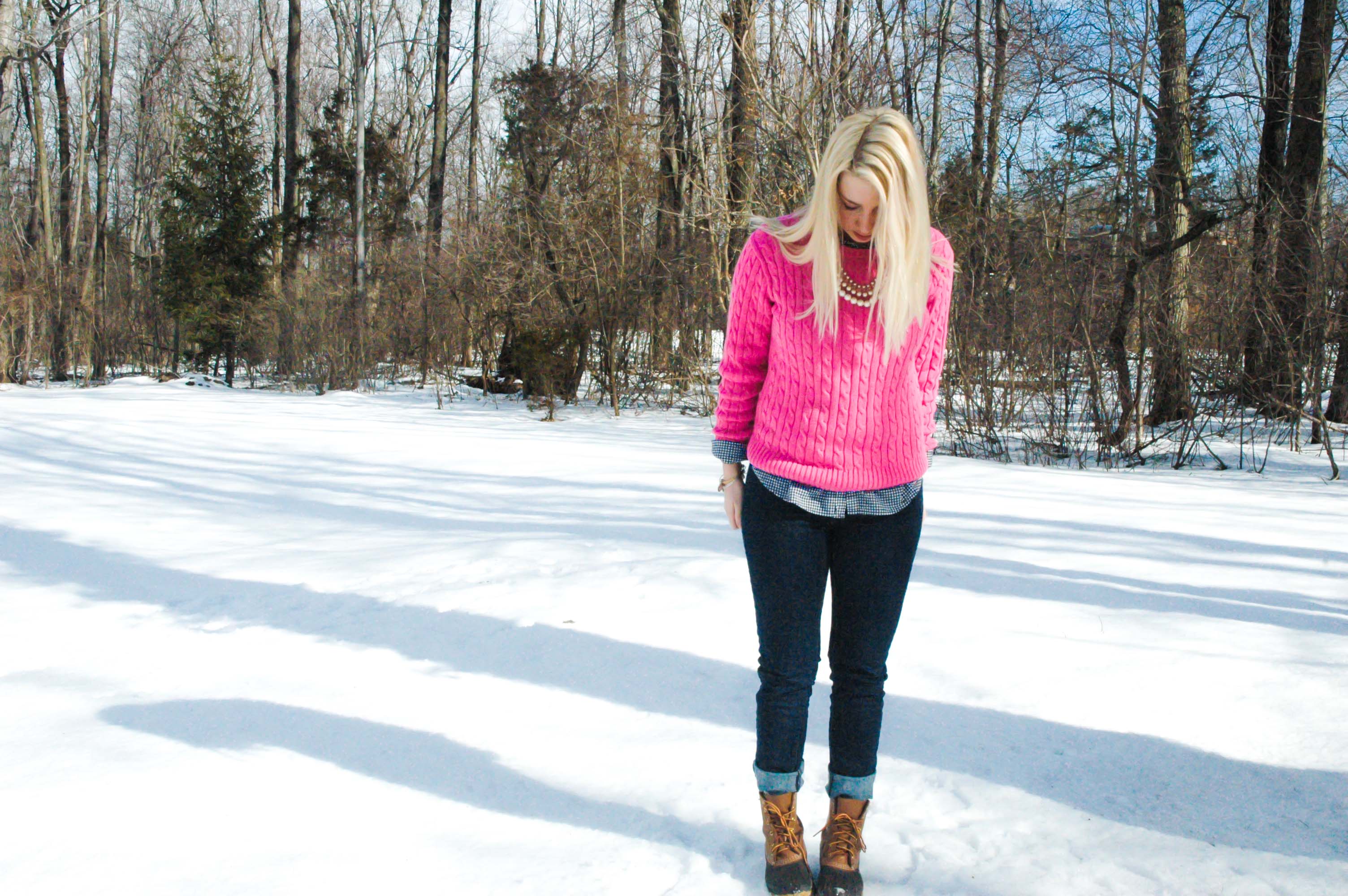With spring quickly approaching (but this cold weather sticking around), I am more than ready to put away the blacks, greys and blues that make up my cold weather wardrobe. It’s a little too soon to be dreaming about sundresses and flats, but there are plenty of ways to transition those winter staples to springtime ready outfits. Here, I layered my Lilly Pulitzer pink cable knit sweater with a black & white gingham button down .