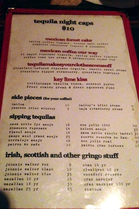 Even though we were filling up on the chips, we knew we needed to order something other than another round of drinks and so we gave the vertical nachos a try. It’s not surprising that they too were pretty awesome. Essentially, they were an extremely delicious queso with beans & guacamole in the center and chips standing up throughout it. By this point in the night, we were pretty full, but we couldn’t pass up trying one of their tequila night caps.