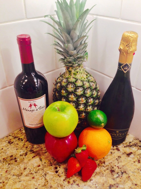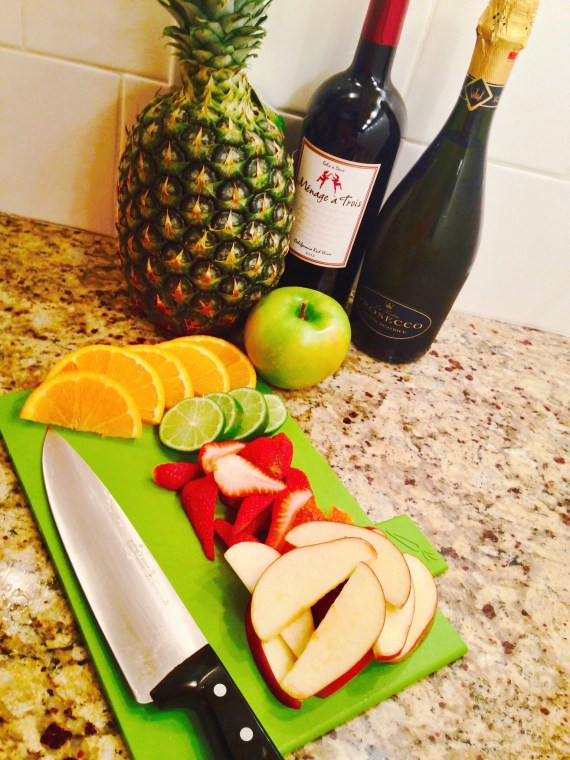 I start out with a good bottle of red wine. I like to use red blends since they stay consistent from year to year. Ménage à Trois Red and Apothic Red are two of my favorites. Then, I add a lot of fruit. My usual go to fruits are strawberries, oranges, pineapples, limes, and apples, but you can use anything that is in season.