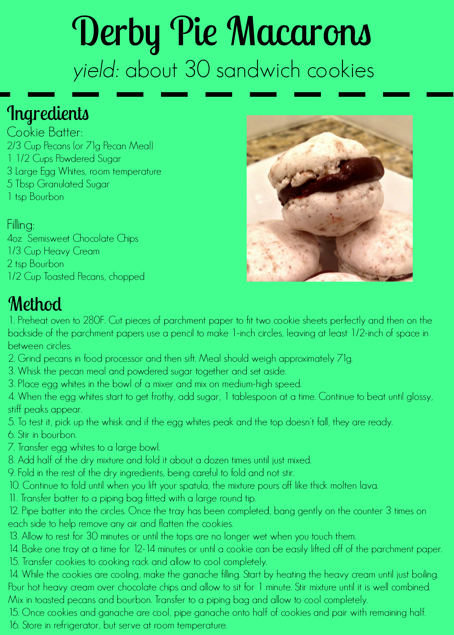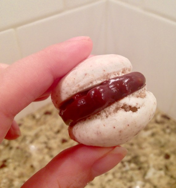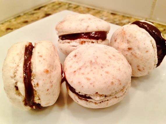While I’ve made macarons with hazelnut meal and of course the traditional almond flour, I’ve never tried them with pecan meal. I couldn’t find pecan meal at my grocery store and so this was also my first time using my food processor to grind nuts into meal. Luckily, both worked out really well. I think the key to my success, is the fact that I weigh out the meal in my macaron recipes which makes it easy to switch from one variety of nut meal to another without having to worry about the differences in bulk density (sometimes a degree in chemical engineering does come in handy when baking). Once I figured out how to adapt my Vanilla Macaron recipe, it was smooth sailing. The end result was cookies that had a great pecan and bourbon flavor. Then it was time to make the filling. At first I thought I would just make a bourbon ganache, but I decided to add toasted pecans to give it a bit more texture and make it more similar to a true Derby Pie. The results were absolutely delicious.