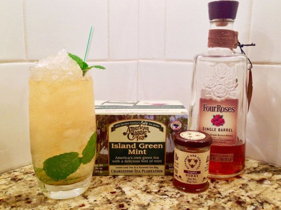 Since this is my first year really celebrating the Kentucky Derby, I want to do it right and so I decided I would just have to come up with a variation on the mint julep that I liked. As I was brainstorming, I realized that I still had some of the Mint Green Tea I had bought at Charleston Tea Plantation a few weeks ago. While we were there, I had tried an iced version that was sweetened. While I typically drink my tea with nothing added (except maybe ice if it’s a hot day), I figured a sweetened mint green tea would be the perfect substitute for the mint simple syrup. I brewed up a whole pot of tea and sweetened it with some tulepo honey from Savannah Bee Company.