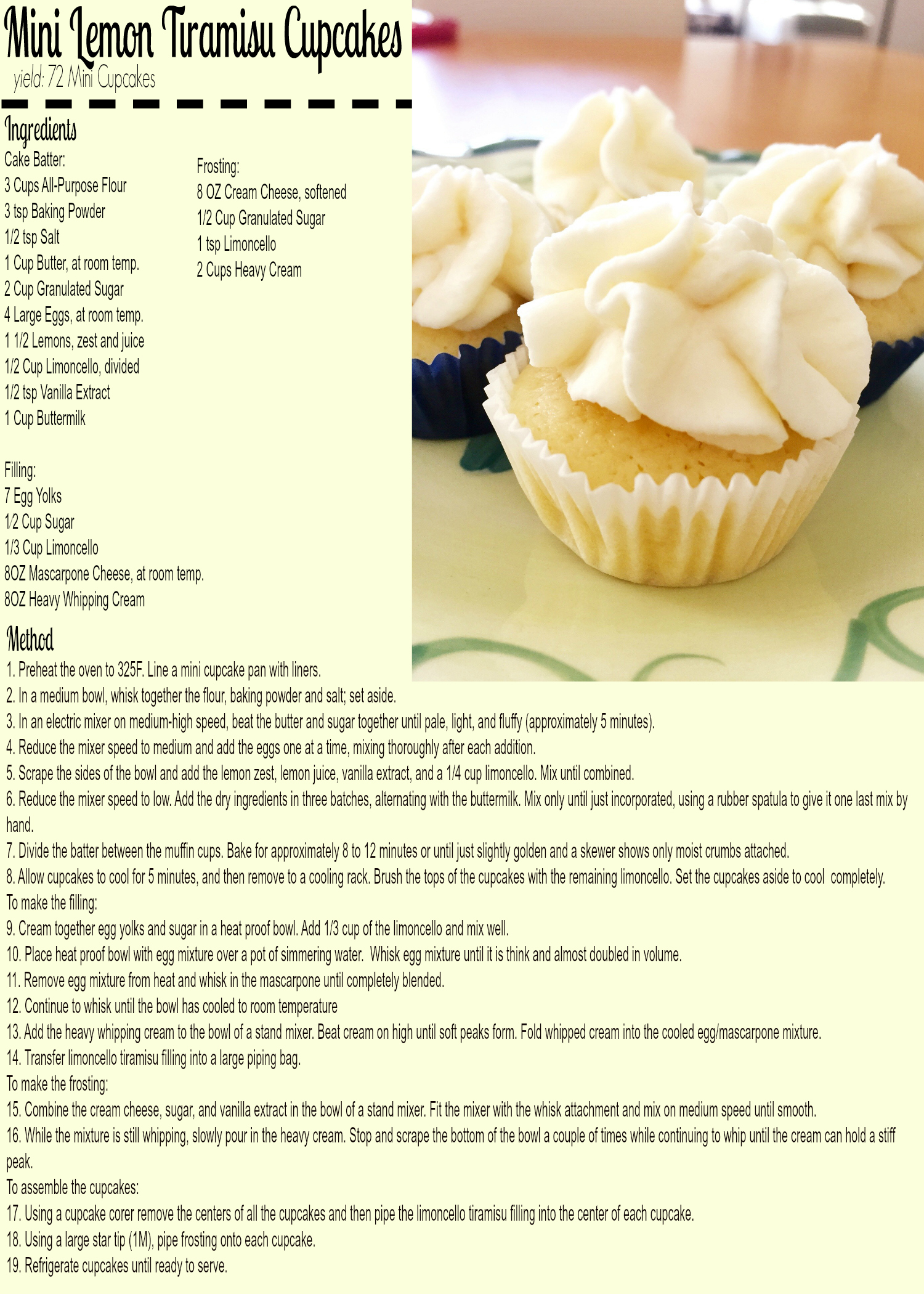 The end result was a cupcake that tasted very similar to limoncello tiramisu and was super refreshing on a hot day. Needless to say, these cupcakes will definitely be making an appearance at many future events!