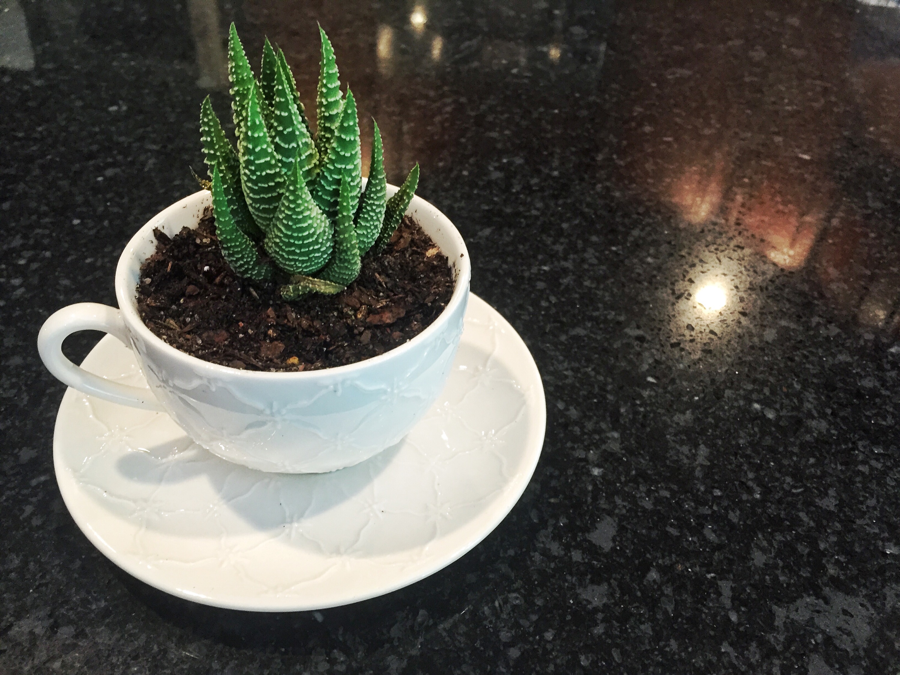 I am totally still in denial that Sarah’s bridal shower is over but to take my mind off of it, I did a little DIY project I’ve been staring at on Pinterest for far too long. Lucky for me, the gift at Sarah’s bridal shower was succulents which means I could finally start my mini Pinterest project/diy decor for my room. All that I had to do was put the succulents into cute tea cups. I found a cute white tea cup at Home Goods for $4.99. I popped my succulent into the cup and I am so happy with how it came out!