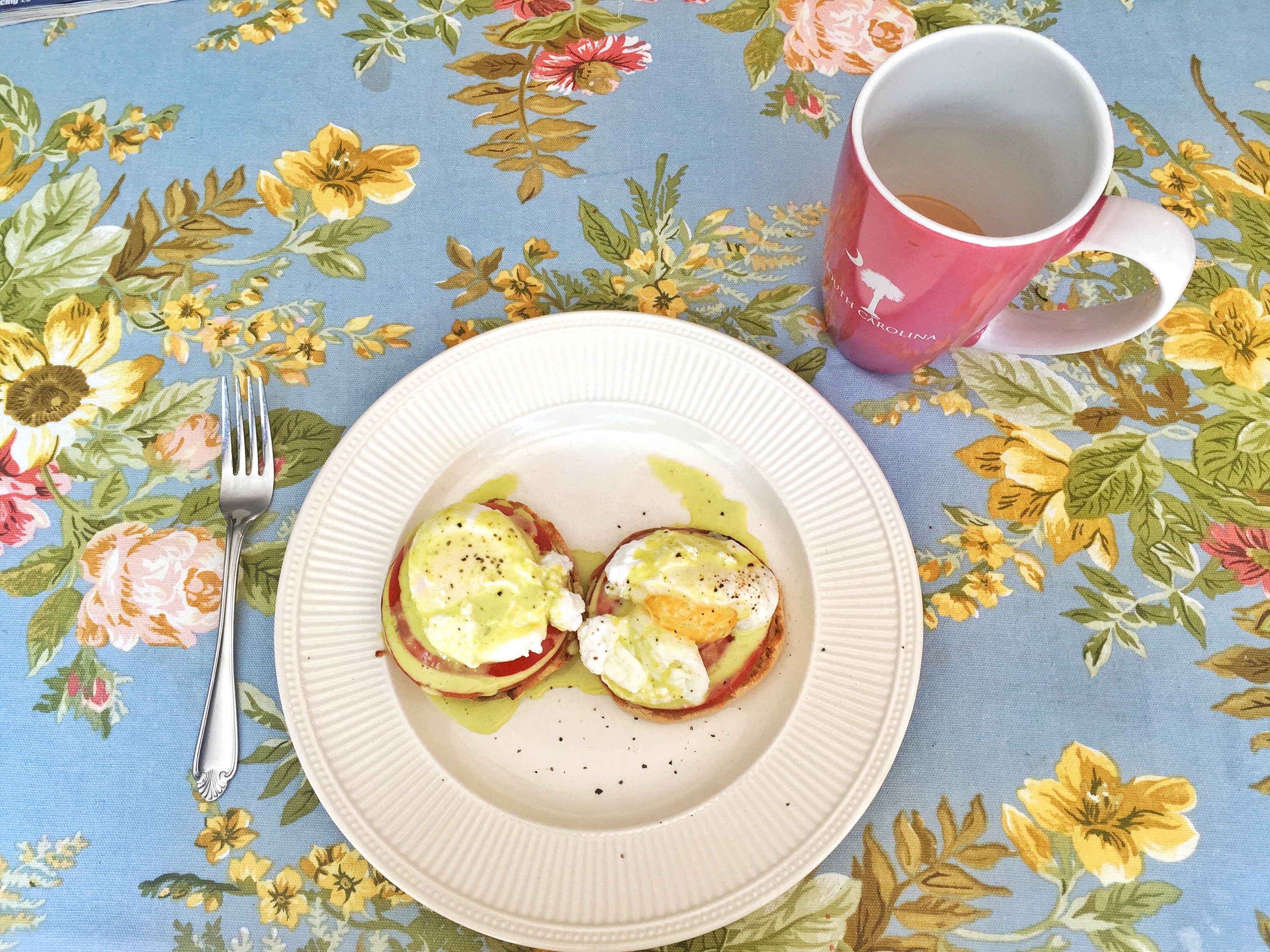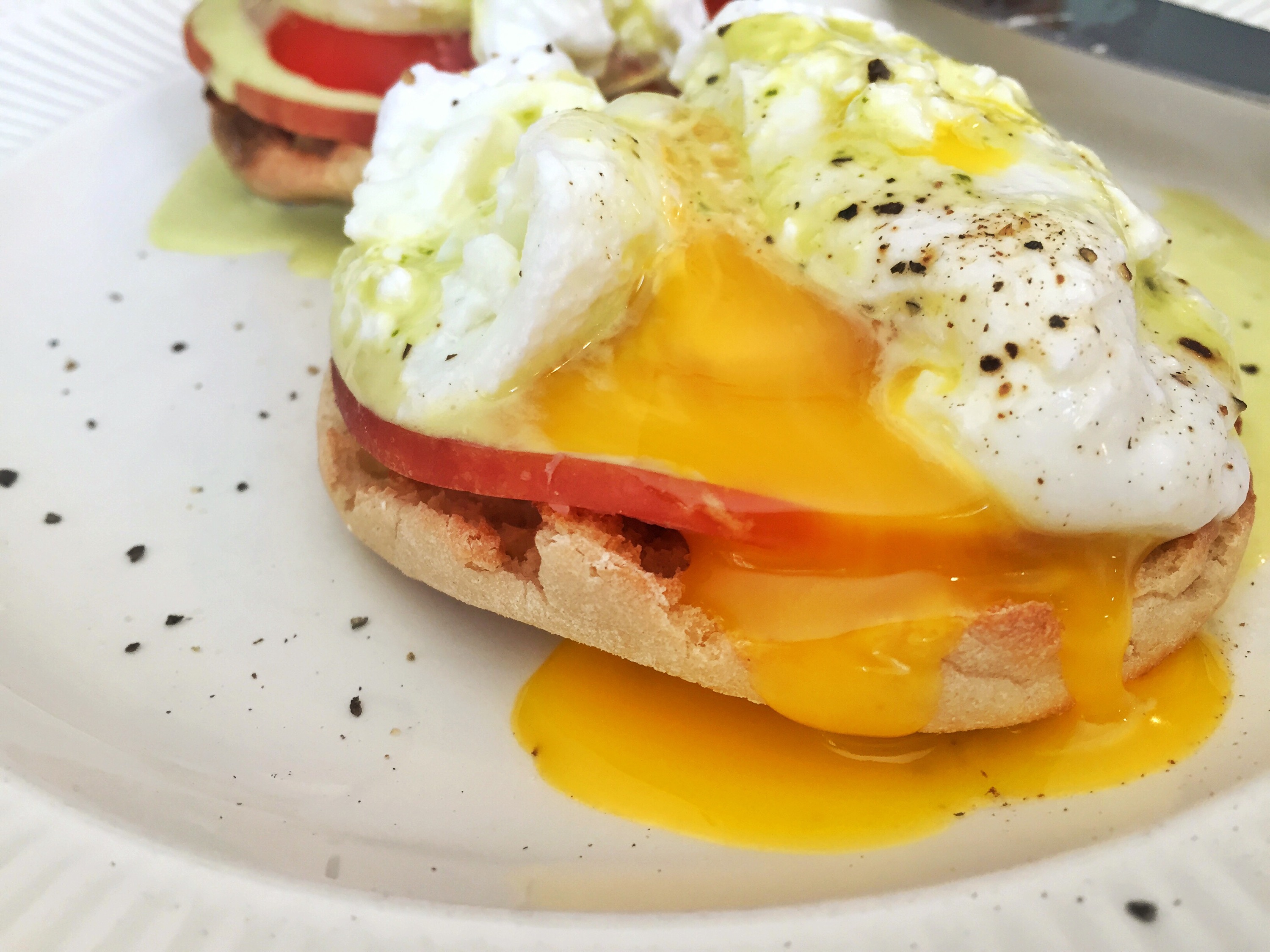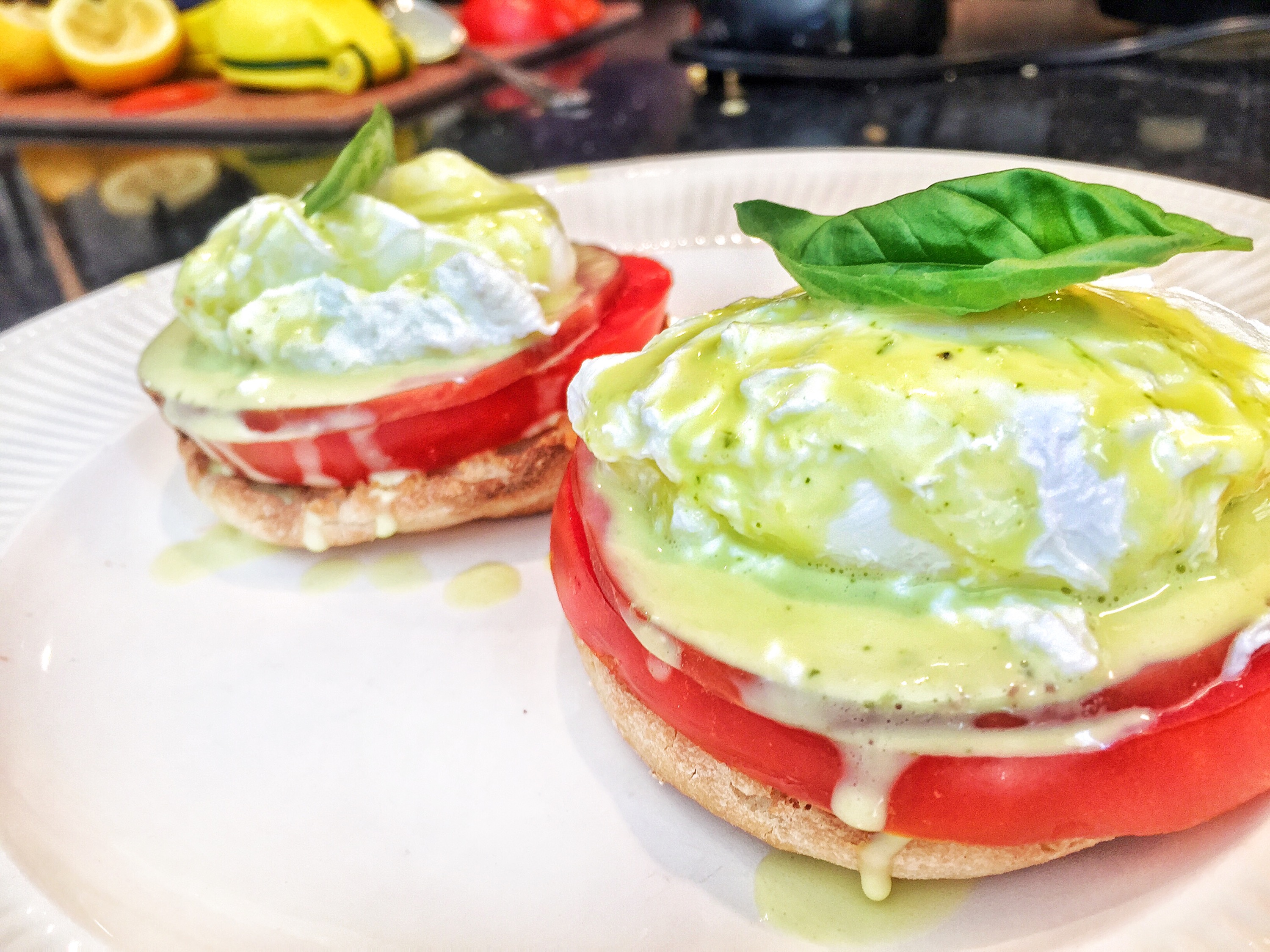 It turned out better than I could have hoped! It was the prefect summertime twist on a classic. The basil hollandaise, while a bit intense in basil flavor on its own, tasted amazing with the fresh tomato, poached egg, Canadian bacon, and English muffin! The eggs were also cooked perfectly (although if you like them a bit on runnier side you might want to reduce the cooking time to 4.5 minutes).