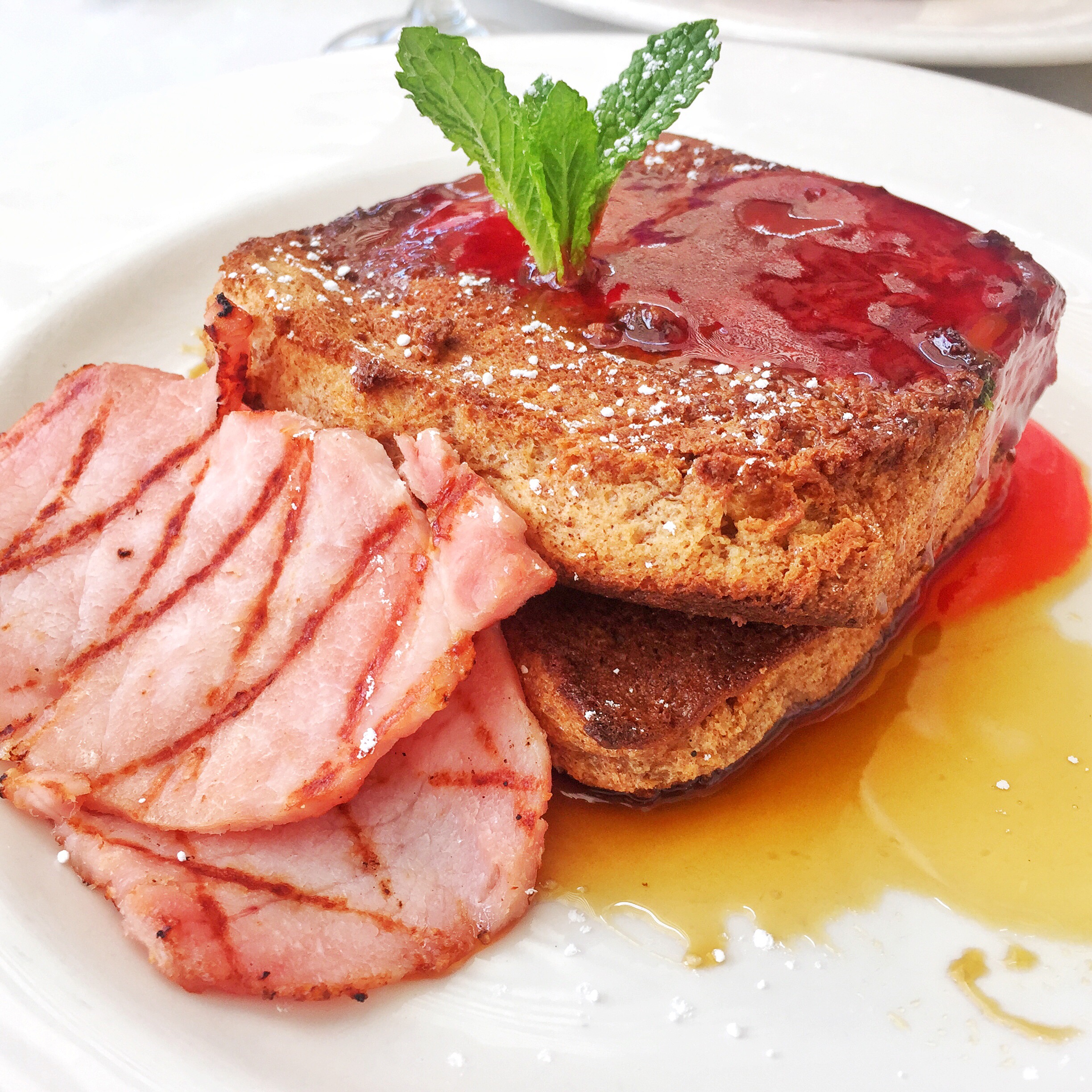 The night before, I scoured the internet for somewhere to grab breakfast/brunch once we got into the city. We wanted it to be walking distance from the theater so we had a general area we were looking at. We finally decided on 44 & X and luckily they still had reservations open for the next morning! We opted to eat outside because it was so nice and Tori and I love to people watch. You know when you go to an Italian restaurant and they immediately give you bread and butter to snack on while you read the menu? Well, 44 & X gives you a basket of mini muffins, butter, and mini jars of jelly and it is incredible. Their muffins are insanely moist and the perfect size for some pre-brunch munching. Their cocktail list is pretty impressive with fun twists on classic morning cocktails. Tori was a bit in shock over the prices since she’s used to how cheap drinking was in college (her Mimosa was $11), but I thought they were fair priced for where we were in the city and the fact that this was the city. The menu is pretty standard with a few standout items. Tori ordered Hazelnut Brioche french toast with raspberry compote and smoked irish bacon aka ham.