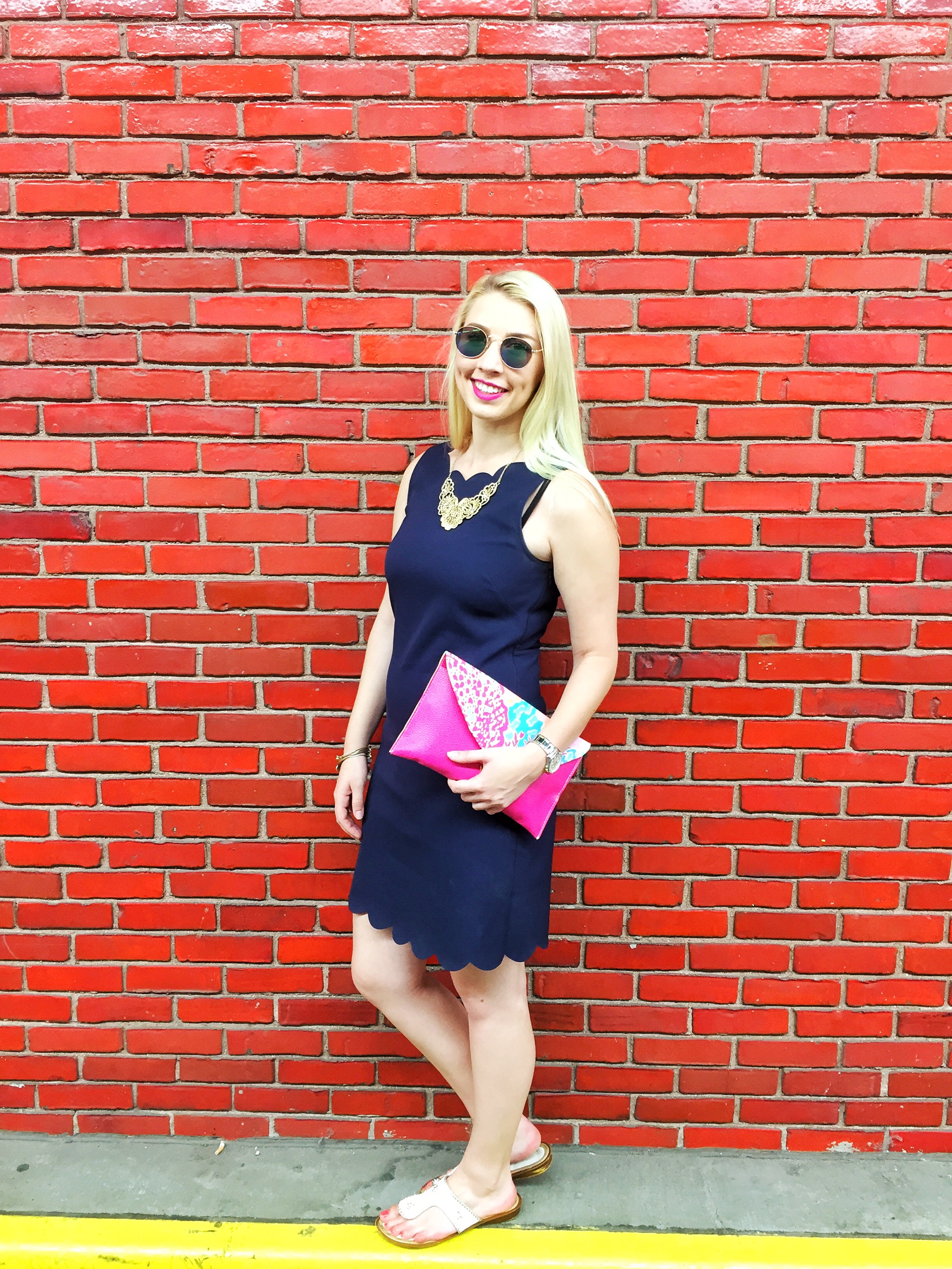 Since the weather was going up to mid-80s and Tori wanted to look nice for the show, she decided to wear her J. Crew navy blue scalloped dress. She paired it with her Jack Rodger-esque sandals and a Lilly Pulitzer clutch she bought off etsy a few months ago. Tori added a fun pop with hot pink lip stick and kept the look more casual with her funky round sunglasses!
