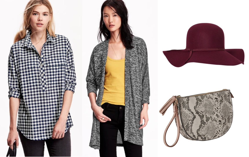 Clothes are hit or miss from Old Navy when it comes to the fit and size. When a bunch of items I like start showing up online, I’ll pop into the store and figure out what I do and don’t like and what size I am for the clothes I do like! I did just that with these items! Long cardigans are going to be everywhere this fall and this dark grey one is so perfect. It’s very light so definitely not going to keep you warm in the cold but it is a great transition piece as we move into Fall! The gingham pullover is sooo comfortable. It’s a boyfriend (aka baggy/loose) fit so if you’re like me and don’t want to be wearing a sack I recommend going a size down! The snakeskin clutch is another great item because it can act as a neutral but still be fun and the tassel detail is too cute! And that hat. Do I really need to explain?